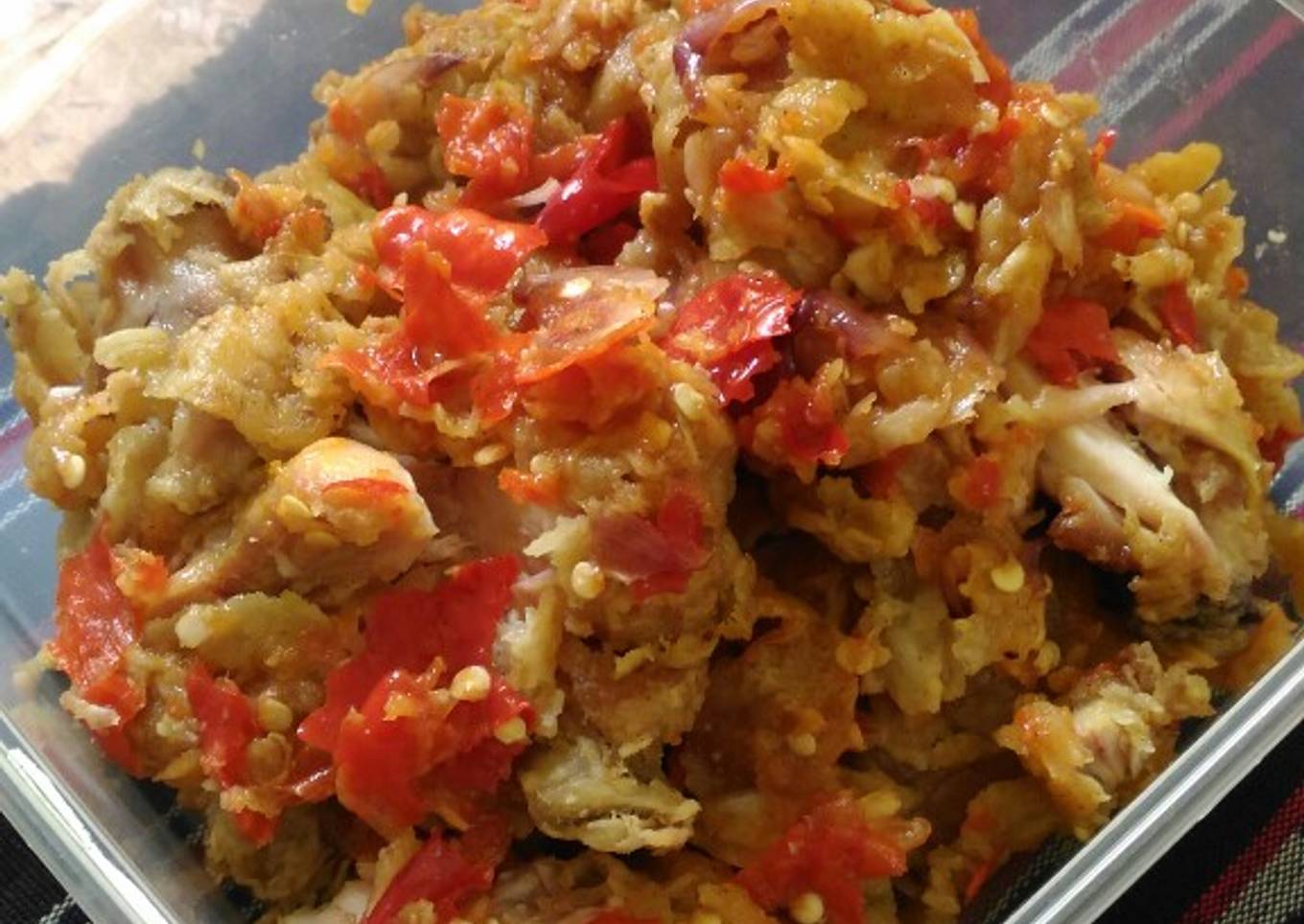 - Tambahkan ayam goreng tepung kemudian geprek di atas ulekan bumbu tadi.