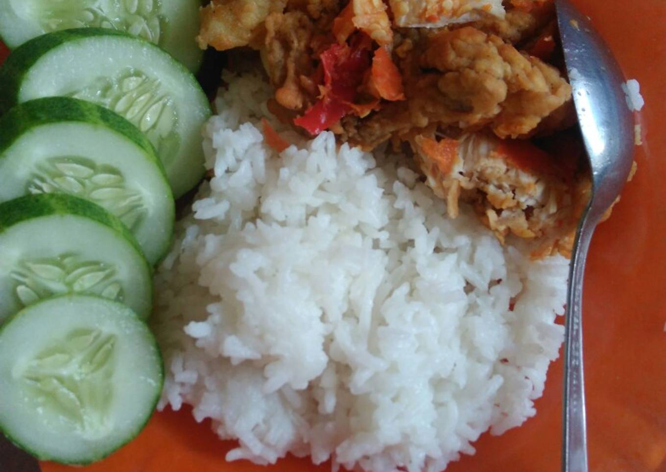 - Ayam geprek siap disajikan dengan nasi Dan lalapan mentimun.