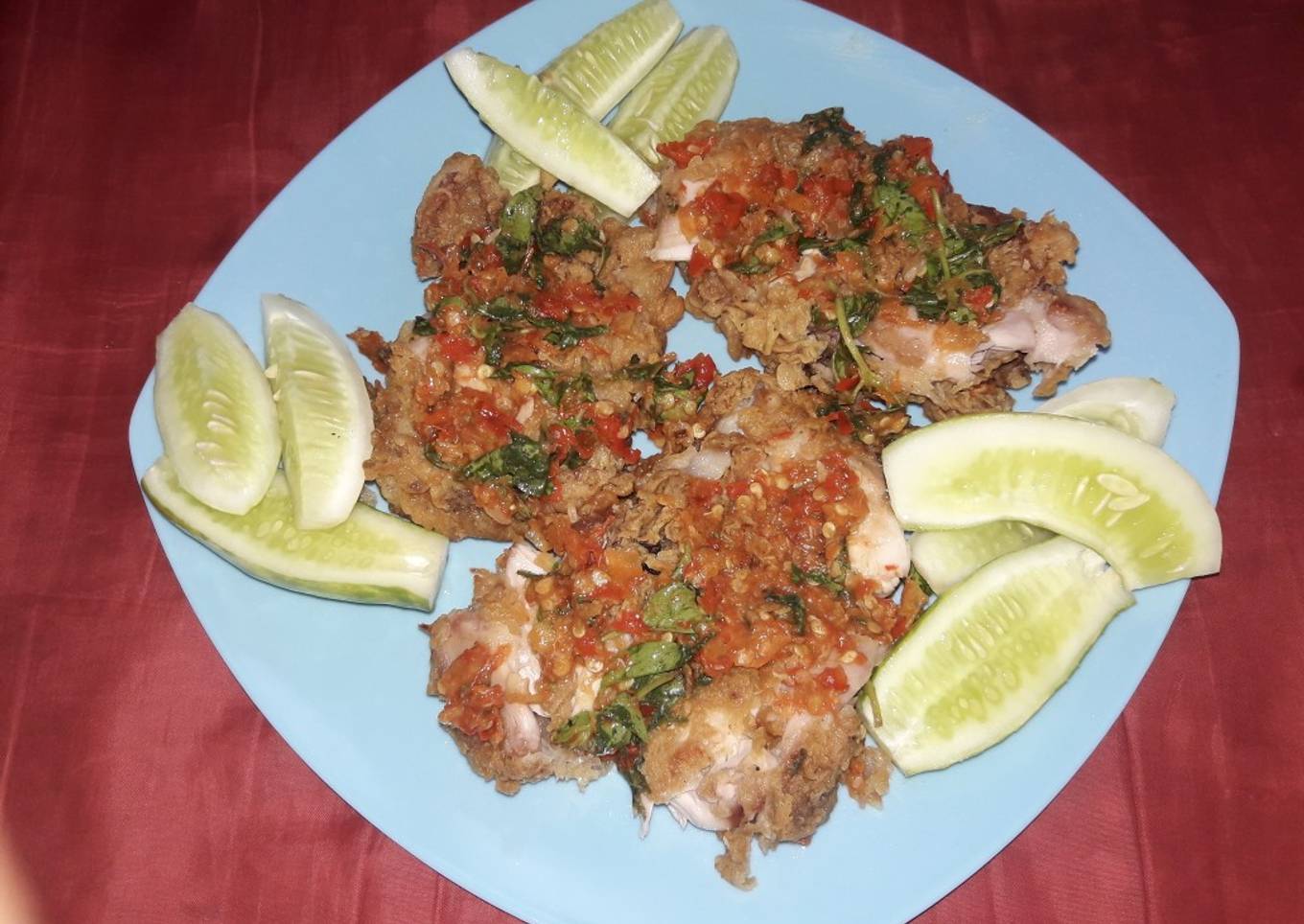 - Setelah itu goreng dengan minyak panas hingga kuning keemasan. angkat tiriskan. sambil menunggu minyak di ayam benar benar tiris, cek rasa sambal yg sudah di ulek kasar tadi, jika asin dan manis nya pas, ambil ayam, taruh di cobek sambal yg sudah di ulek tadi, geprek hingga setengah hancur, jangan lupa masukkan kemangi dan ulek kasar.