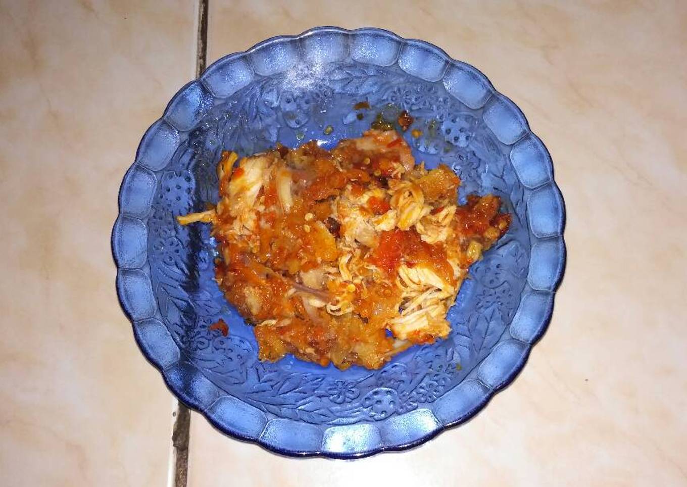 - Setelah Bumbu sudah halus tuangkan 2 Sdm Minyak goreng panas. Lalu Geprek ayam diatas Sambal tersebut.