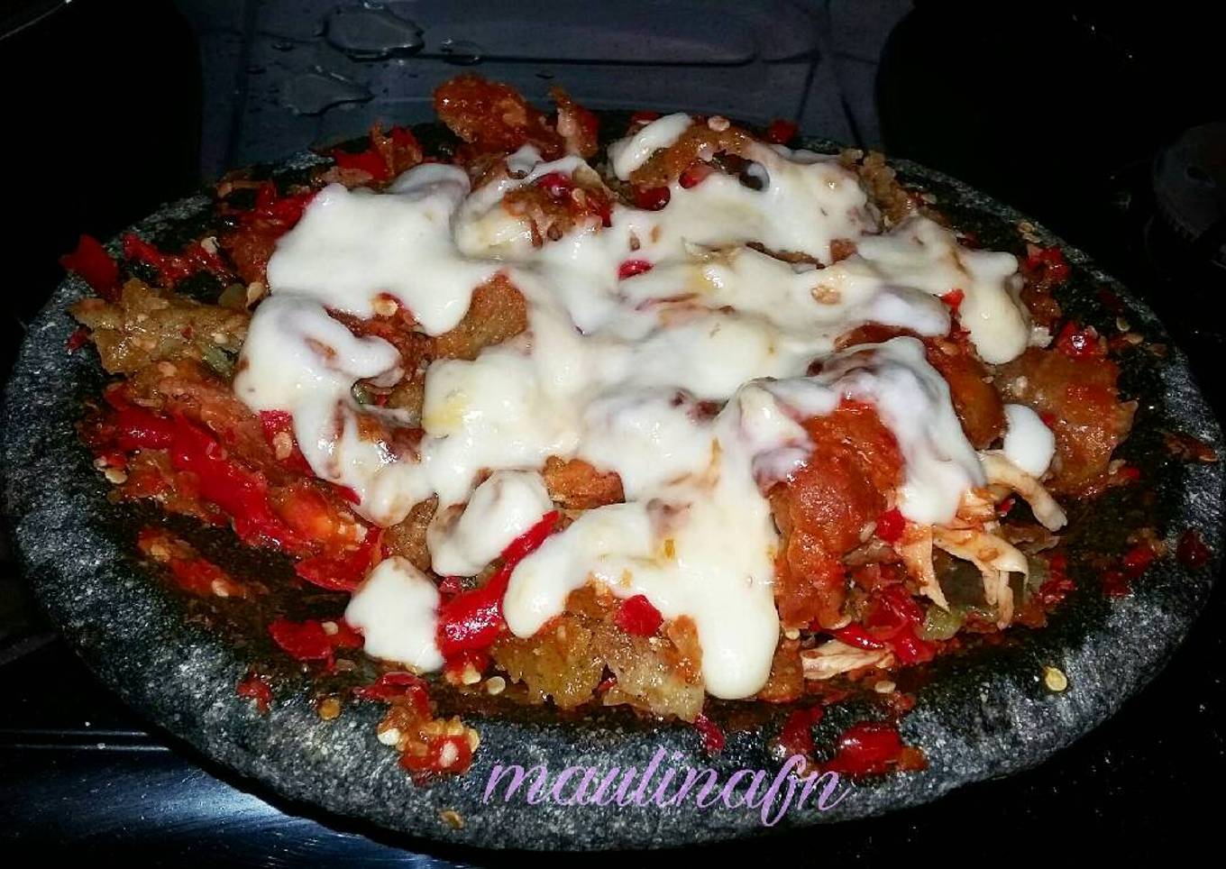 - Ini contoh waktu diaplikasiin ke ayam geprek, aku manasin kejunya pakai teflon anti lengket supaya meleleh trs lgsg dituang ke atas ayamnya