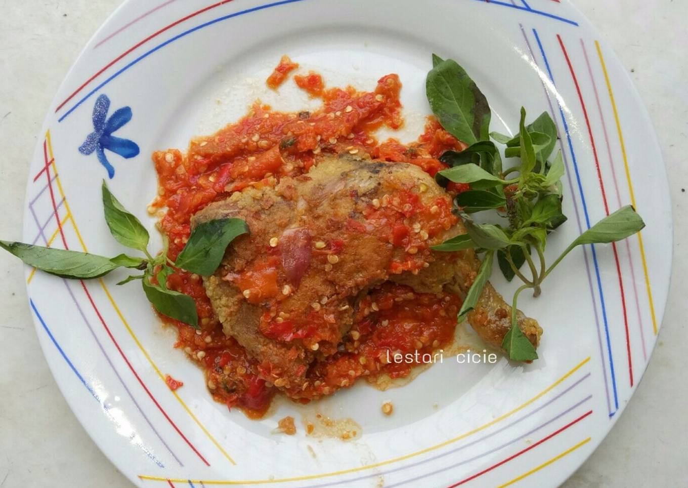 - Taruh sambal di atas ayam crispy sambil di geprek..