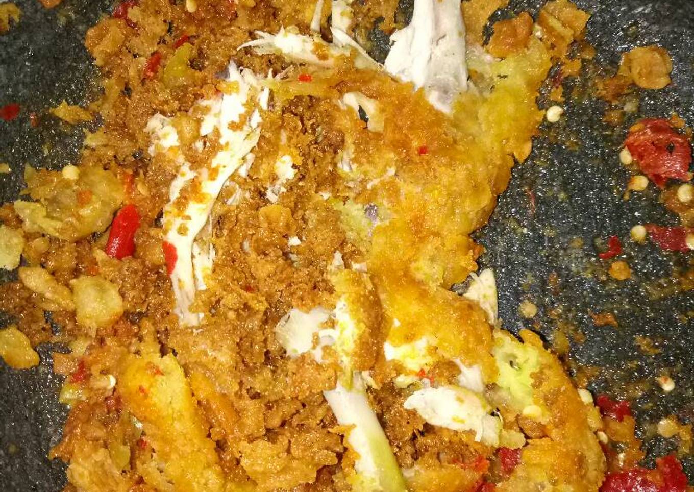 - Campurkan dengan ayam dan tepung kriuuk lalu geprek. Setelah itu siap di hidangkan