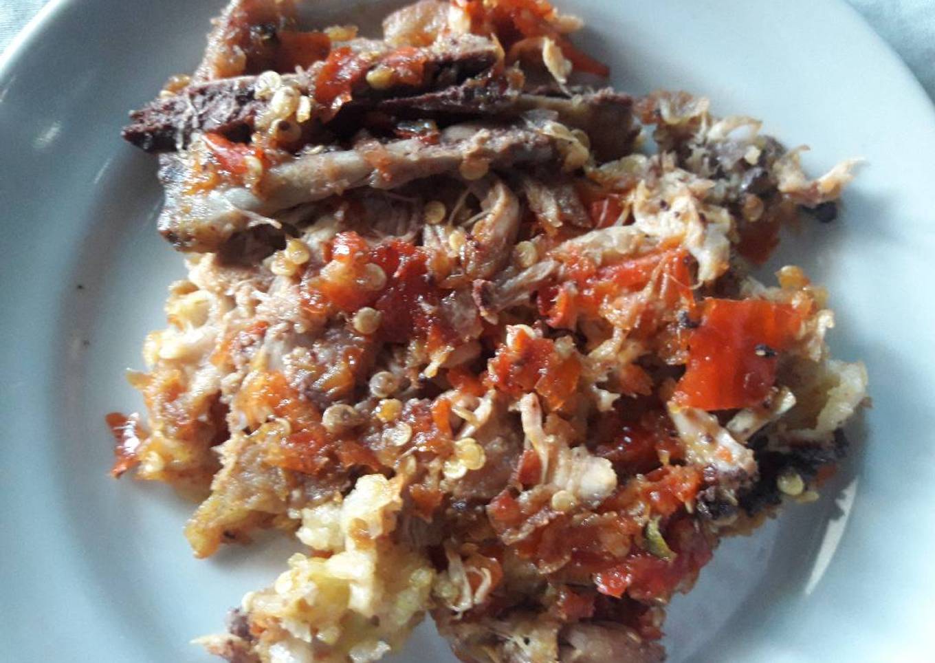 - Taruh ayam yang sudah matang diatas sambal lalu geprek dengan muntu