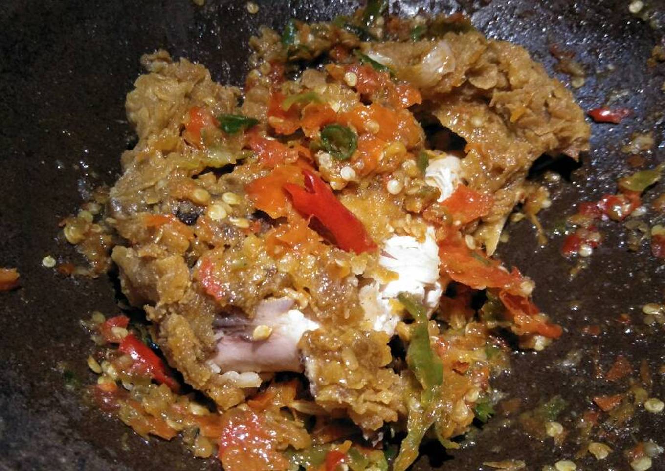 - Ulek semua bahan kecuali ayam.. Setelah diulek terakhir tambahkan minyak panas bekas goreng ayamnya