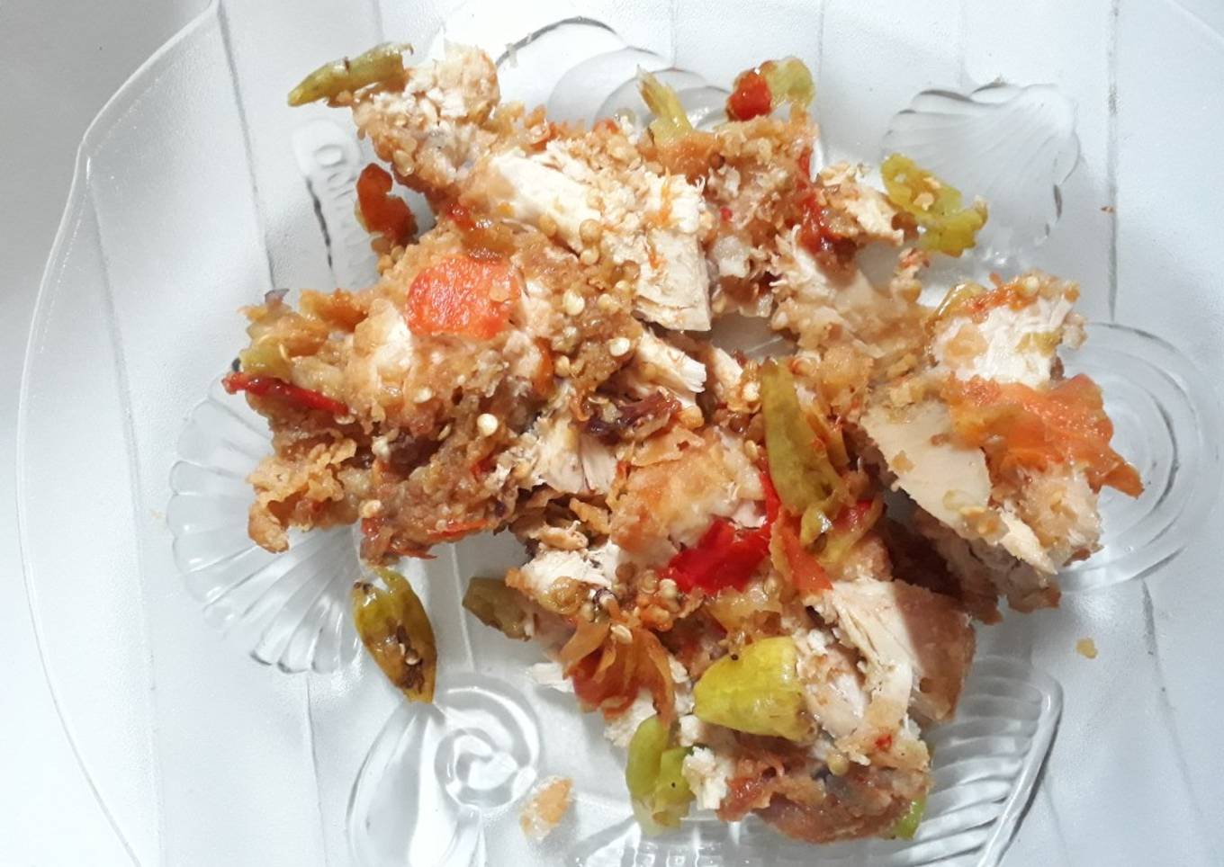 - Masukkan Olive Fried Chicken ke dalam cobek dan geprek bersama sambal