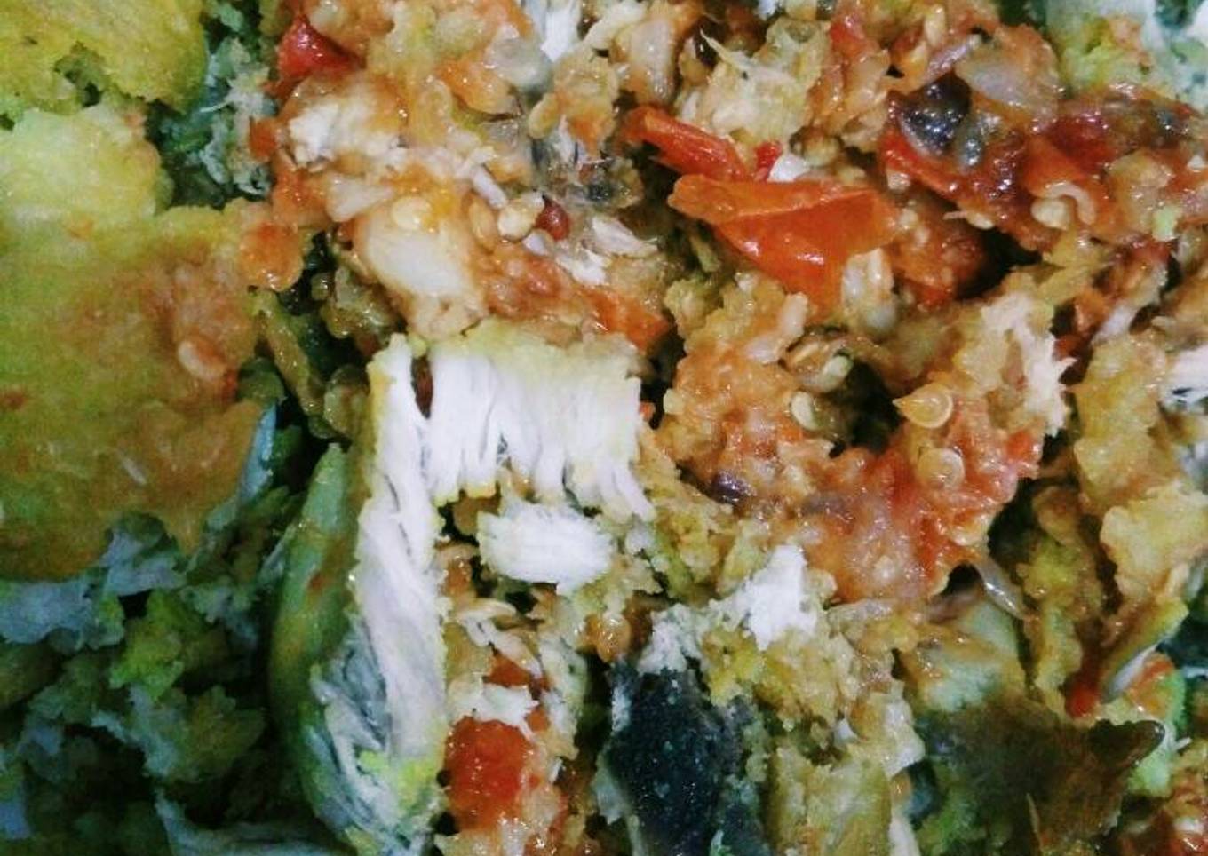 - Di ulek dan masukan gula dan garam, setelah itu masukan ayam yang telah di goreng dan di geprek