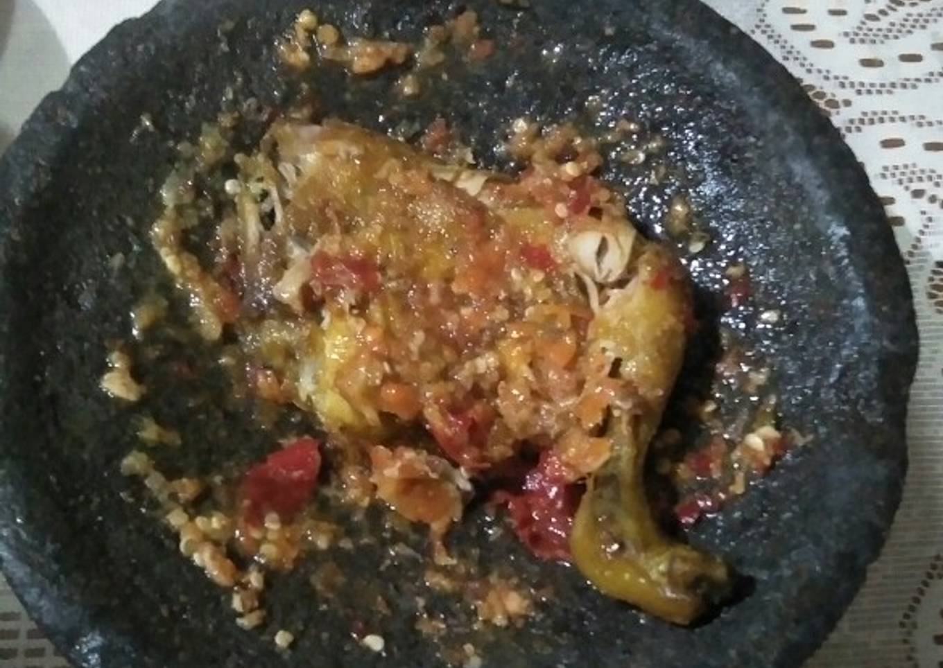 - Ulek cabe merah, bawang putih, cabe rawit, kencur, garam gula secukupnya. Lalu hidangkan diatas ayam yang sudah ditiriskan.