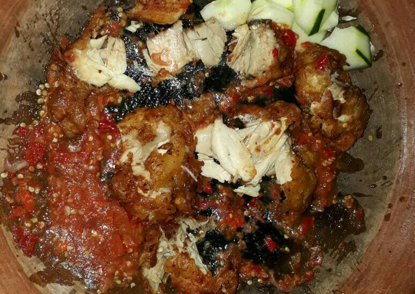 - Ulek cabe rawit,cabe kriting,bawang putih, tomat garam sesuai selera trus ayam juga langsung masuk kan di ulekan juga