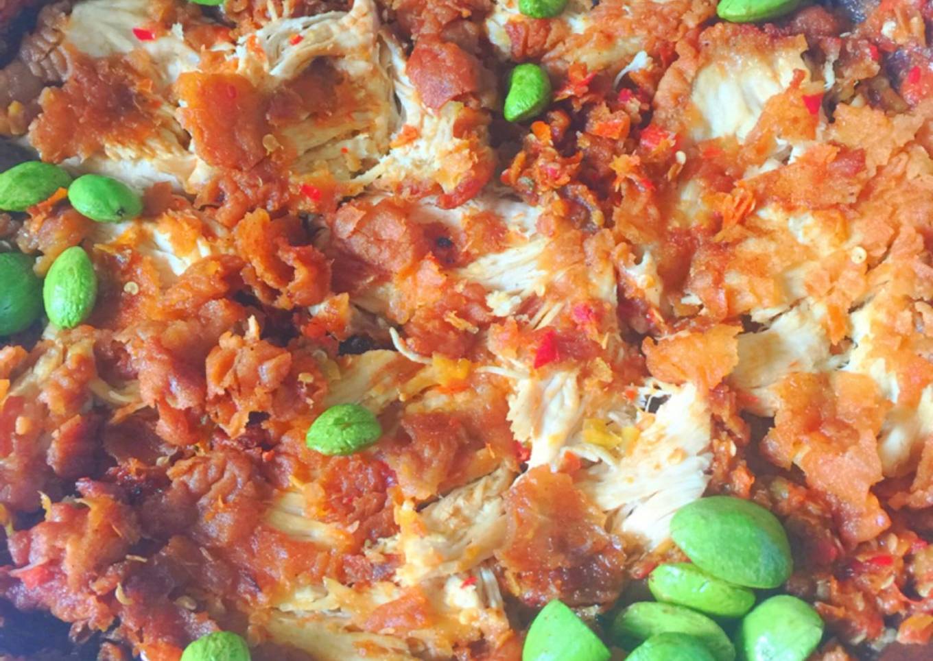 - Ulah cabe,bawang putih,garam,trasi & masako.tambahkan minyak panas uleg bentar dan tambahkan jeruk pecel.masukan ayam di atas sambal lalu penyet2.tambahkan pete yg sudah di goreng di atasnya