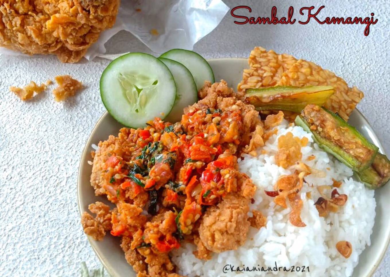 - Siapkan nasi pada piring. Beri ayam crispy. Geprek dengan ulegan lalu beri sambal kemangi diatasnya. Sajikan bersama tempe dan terong goreng