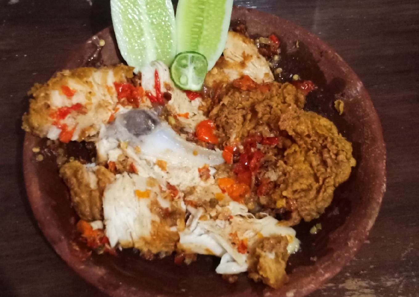 - Ulek kasar sambel masukkan ayam (geprek) siram dengan minyak panas sisa menggoreng tadi (sedikit saja) beri perasan jeruk lemo.