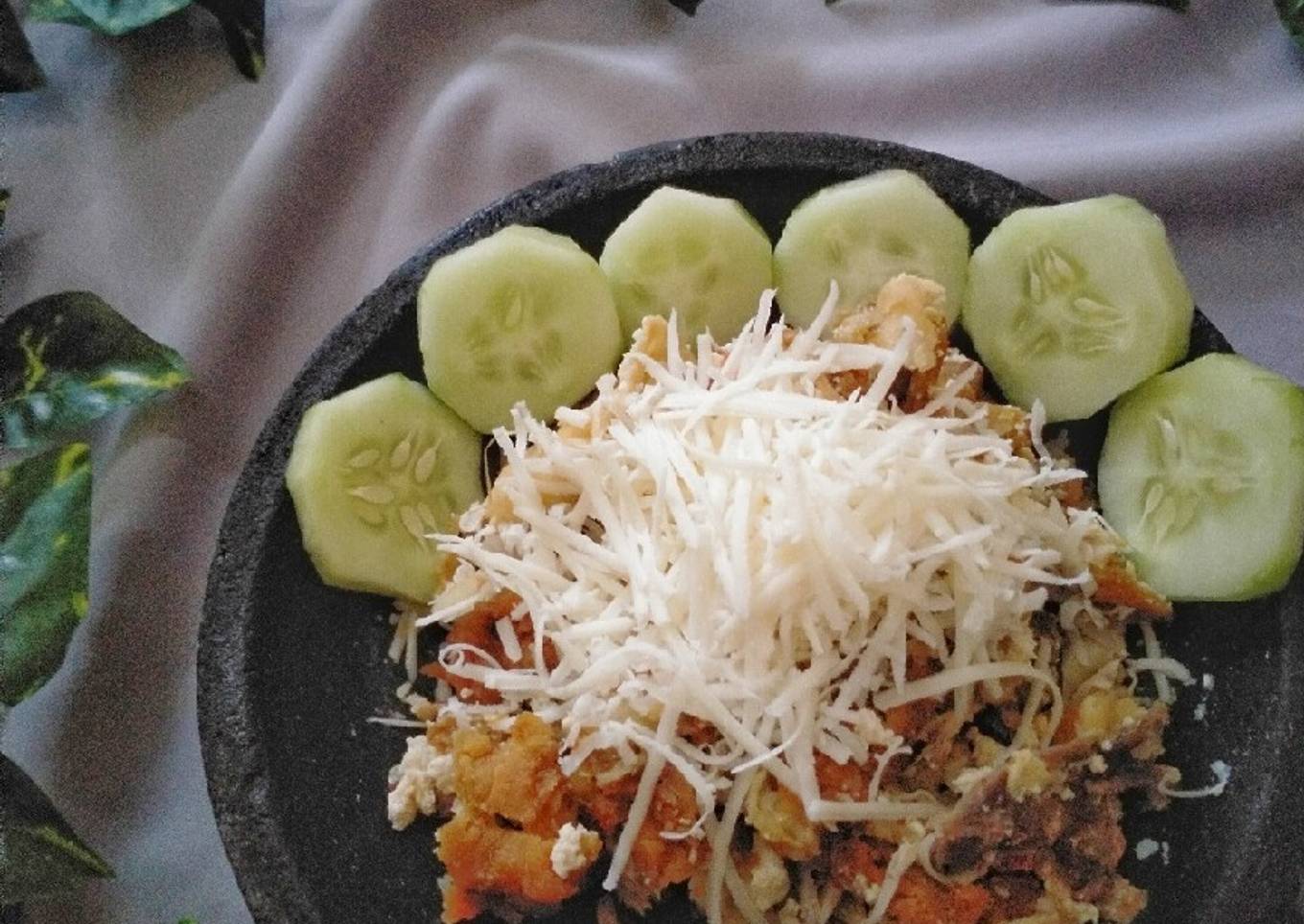 - Kemudian geprek ayam terlebih dahulu lalu geprek tahu.Aduk2 biar merata. Beri parutan keju diatasnya. Ayam geprek siap disantap.