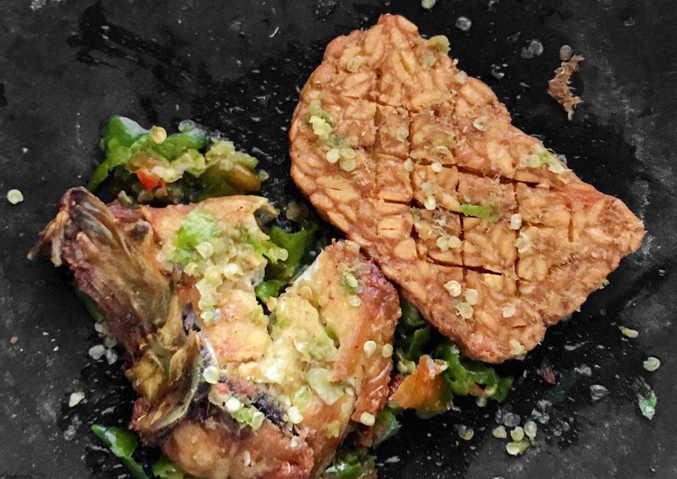 - Geprek ayam dan tempe diatas sambel ijo hingga sedikit hancur. Ayam tempe geprek siap disantap...