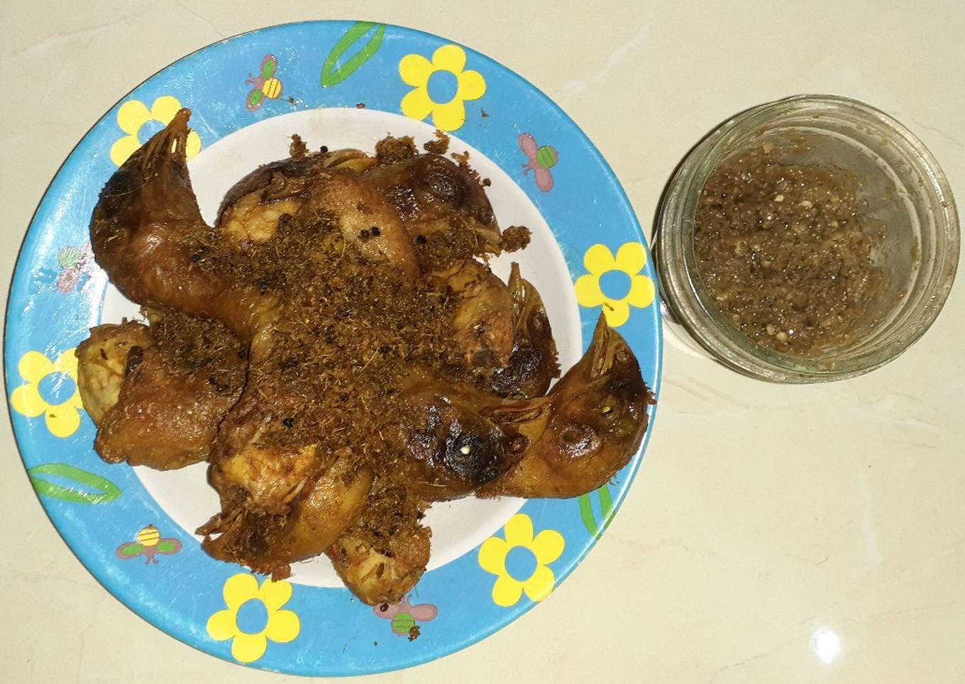 - Setelah selesai menggoreng semuanya tata kepala ayamnya di piring lalu di taburi ampas rebusan tadi.